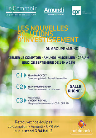 Cette année, nous mettons à l’honneur nos nouvelles solutions d’investissement, lors d’un atelier le jeudi 26 septembre, salle RHONE 1, de 14h à 15h. Il sera animé par Jean-Marc Coly, le directeur général d’Amundi Immobilier, Jean-Philippe Robin, le Directeur commercial de Harvest et Vincent Roynel, le responsable commercial CGP de CPR AM.